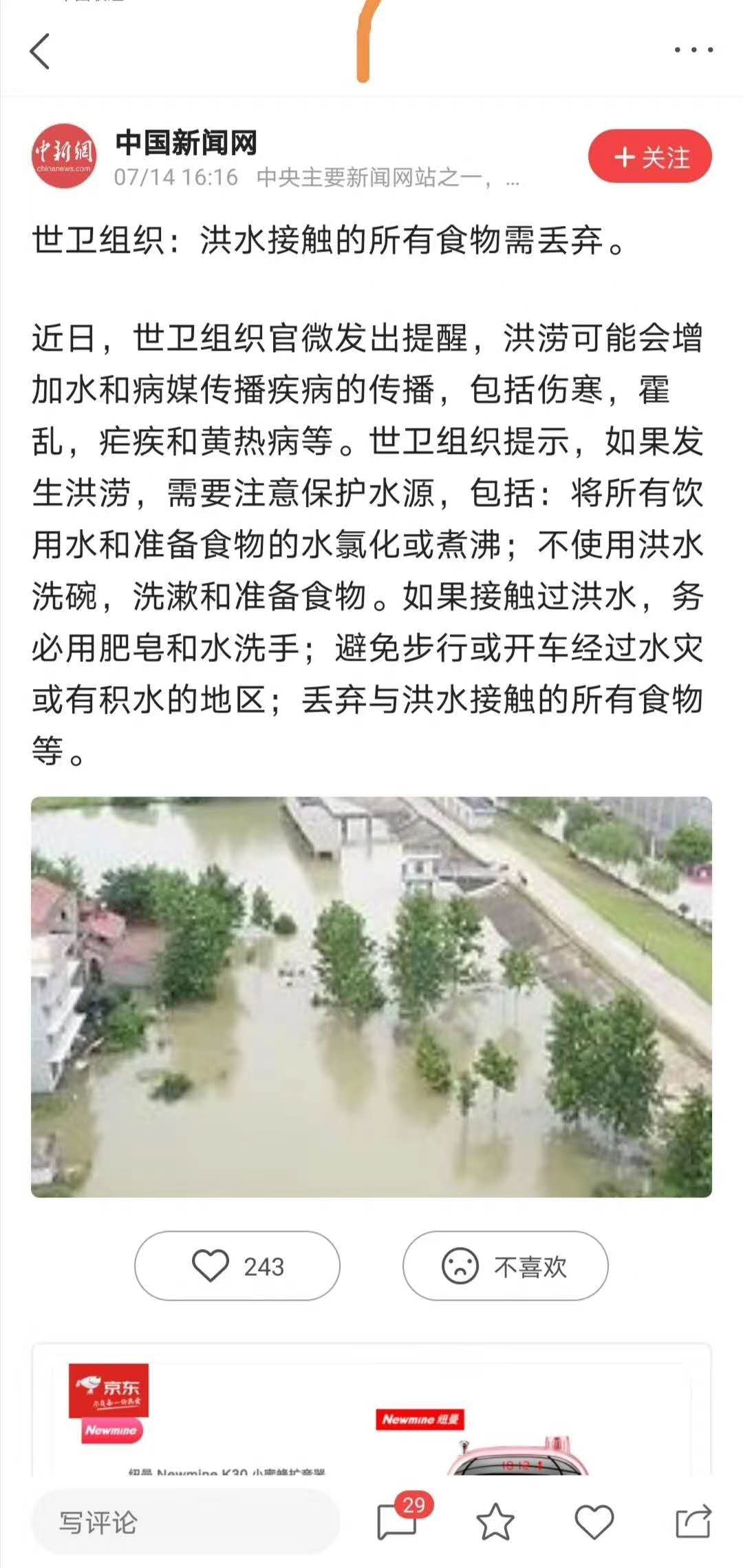 世卫组织:洪涝可能会增加水和病媒传播疾病,应丢弃与洪水接触的所有食物,避免疾病的传播。