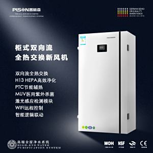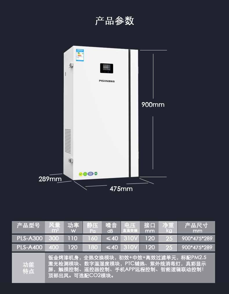 300-400F风量 PLS-A300, PLS-A400 全热交换、PTC辅热、紫外线杀菌 新风量: 300m3/H , 400m3/H 适用面积: 100m3以下 ,140m3以下 噪音大小: ≤ 42dB(A) 洁净等级: 欧标H13 净化工艺: 初效滤网+中效滤网+ HEPA抗菌高效滤网+紫外杀菌+等离子 (选配) 运行模式: 智能、增氧、净化、连续、混风、杀菌